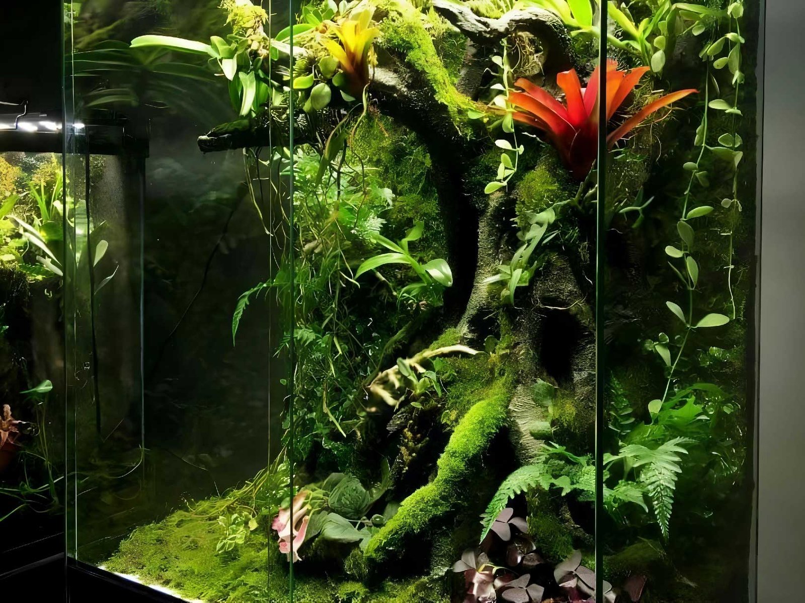 Di dalam terrarium, tanaman dapat tumbuh dengan kondisi minim perawatan. Kelembapan yang terperangkap di dalam wadah menciptakan siklus air alami, di mana air menguap dan kemudian mengembun di dinding wadah sebelum jatuh kembali ke tanah. Ini membuat terrarium sangat cocok bagi orang-orang yang sibuk atau mereka yang tinggal di lingkungan dengan kelembapan rendah. Jenis tanaman yang umum digunakan dalam terrarium adalah yang tahan terhadap kelembapan tinggi, seperti lumut, sukulen, dan pakis.